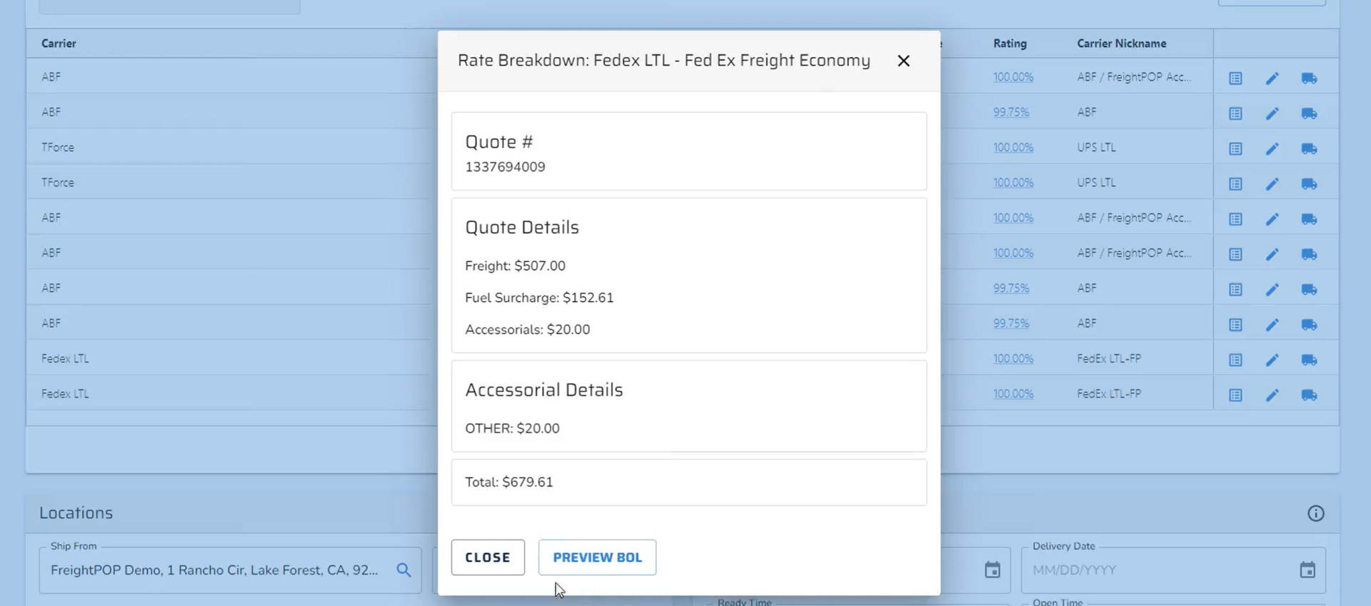 BOL Preview is available within the Quote Breakdown of a given rate after rate shopping. This gives the shipper the ability to preview what is going to print on the BOL prior to shipping so they can review it and make any necessary changes to the shipment.