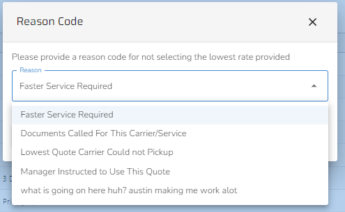 If reason codes are enabled at the company level, a reason must be selected for not choosing the lowest available quote (if applicable) before proceeding to the confirmation page.