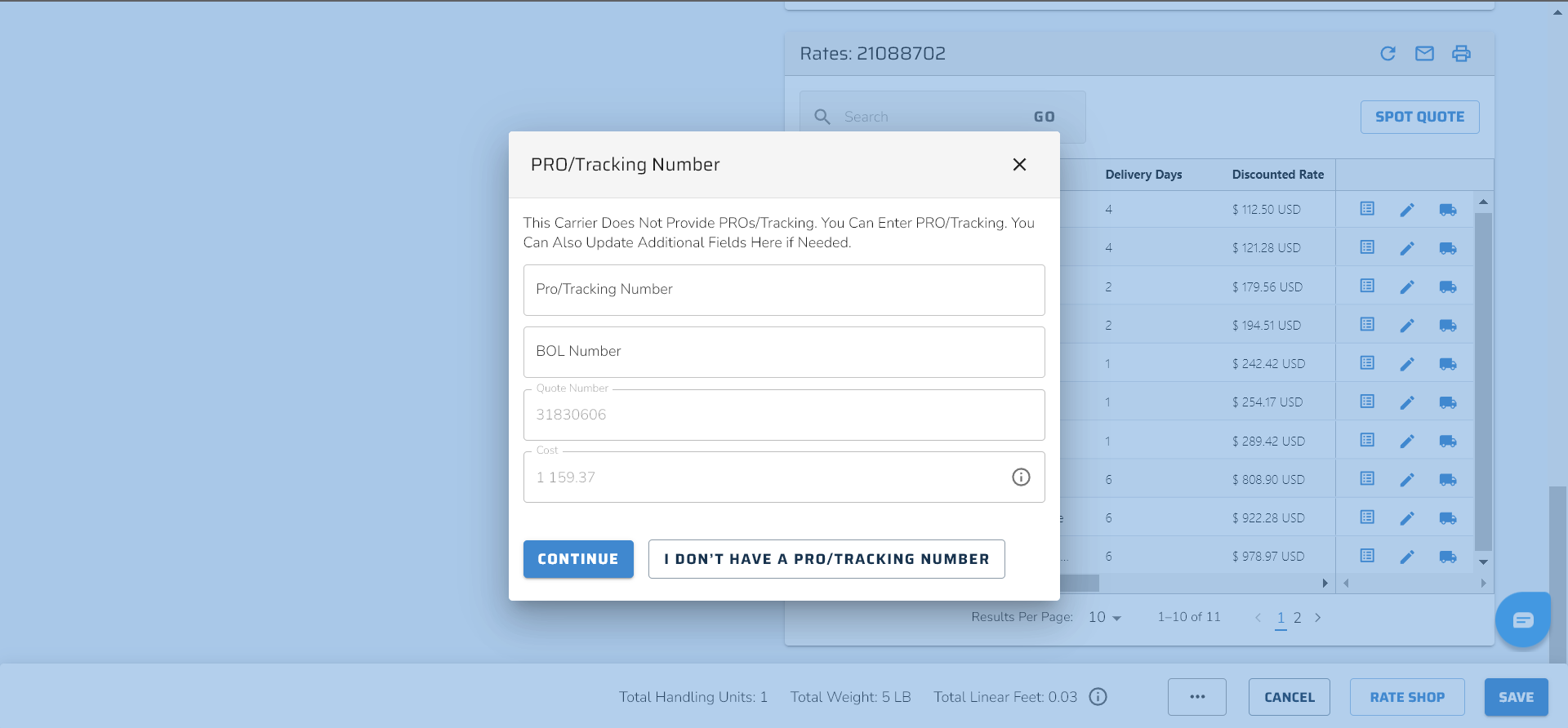"This carrier does not provide PROs/Tracking. You can enter a PRO/Tracking. You can also update the additional fields here if needed."